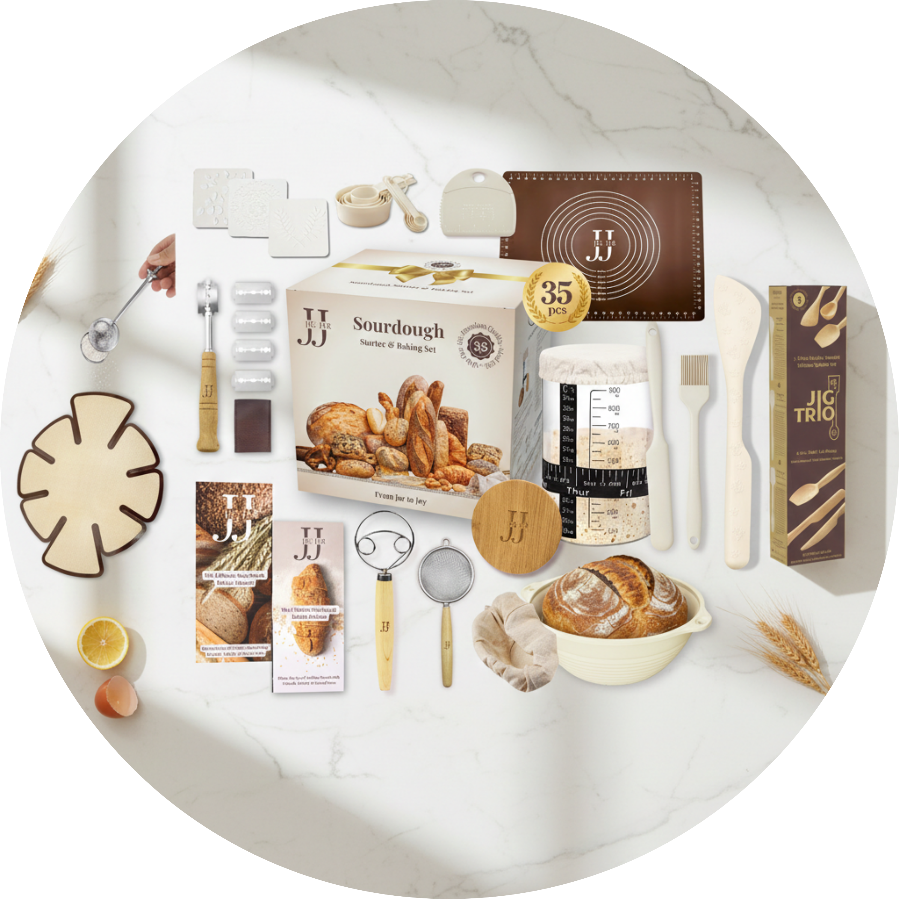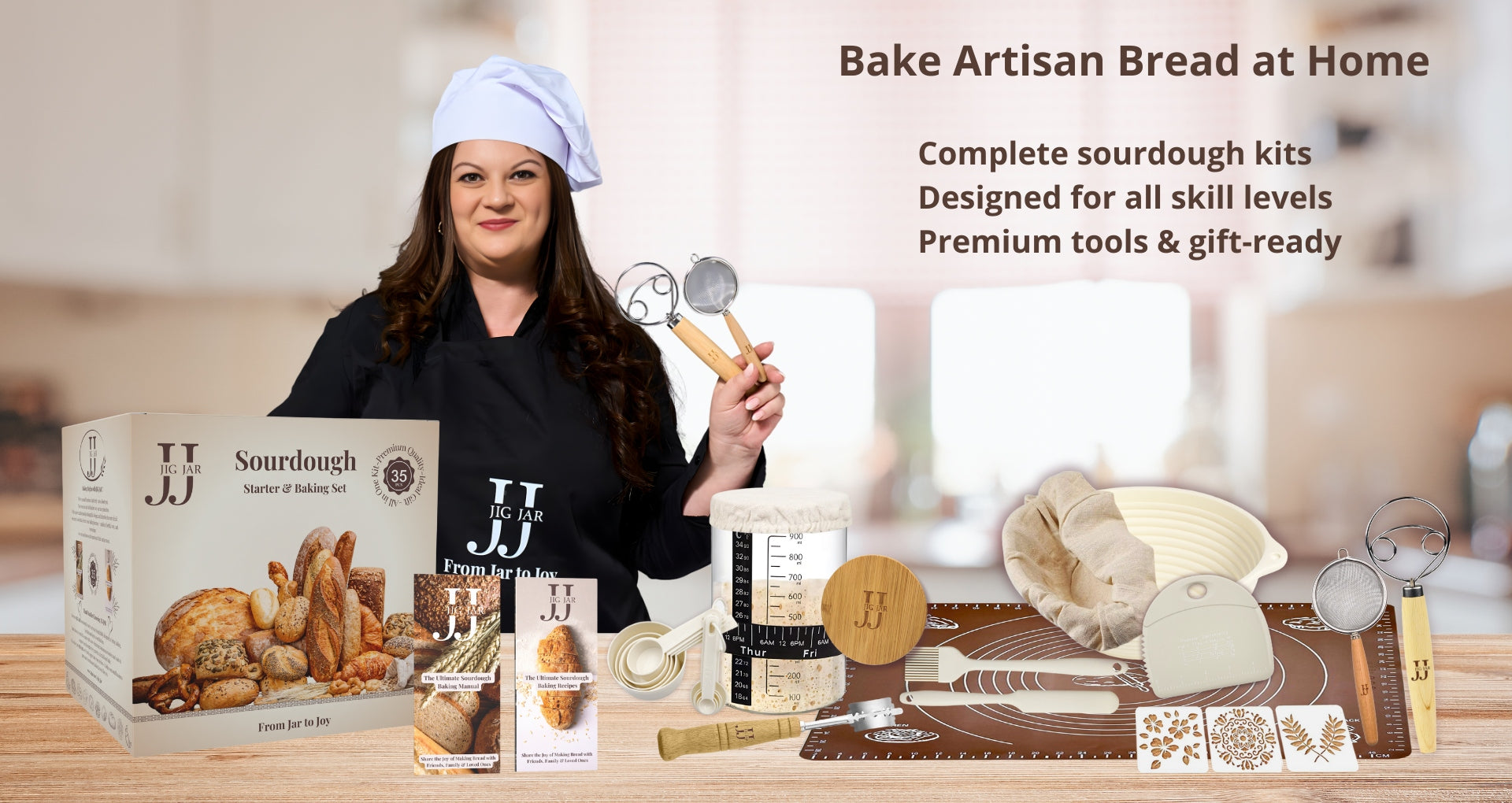 صُنعت أدوات JIG JAR ومجموعات العجين المخمر من مواد عالية الجودة وبتغليف أنيق، وهي مصممة لتبدو جميلة في مطبخك وتُعد هدايا قيّمة وجاهزة للإهداء.